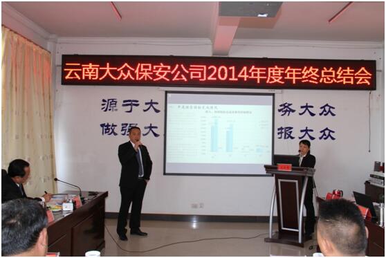 2015年2月11日早上8:30時,云南大眾保安服務有限公司在公司四樓會議室召開了2014年度總結大會。會議由行政總監(jiān)主持,公司總經(jīng)理、副總經(jīng)理、各中心總監(jiān)、分公司總經(jīng)理、各縣分公司經(jīng)理及相關人員共100余人參加了此次會議。